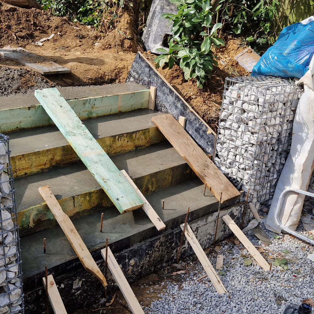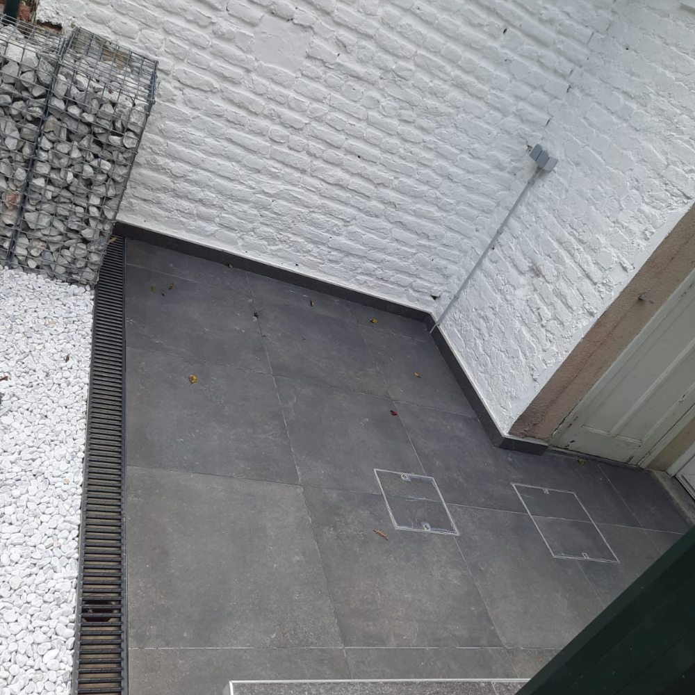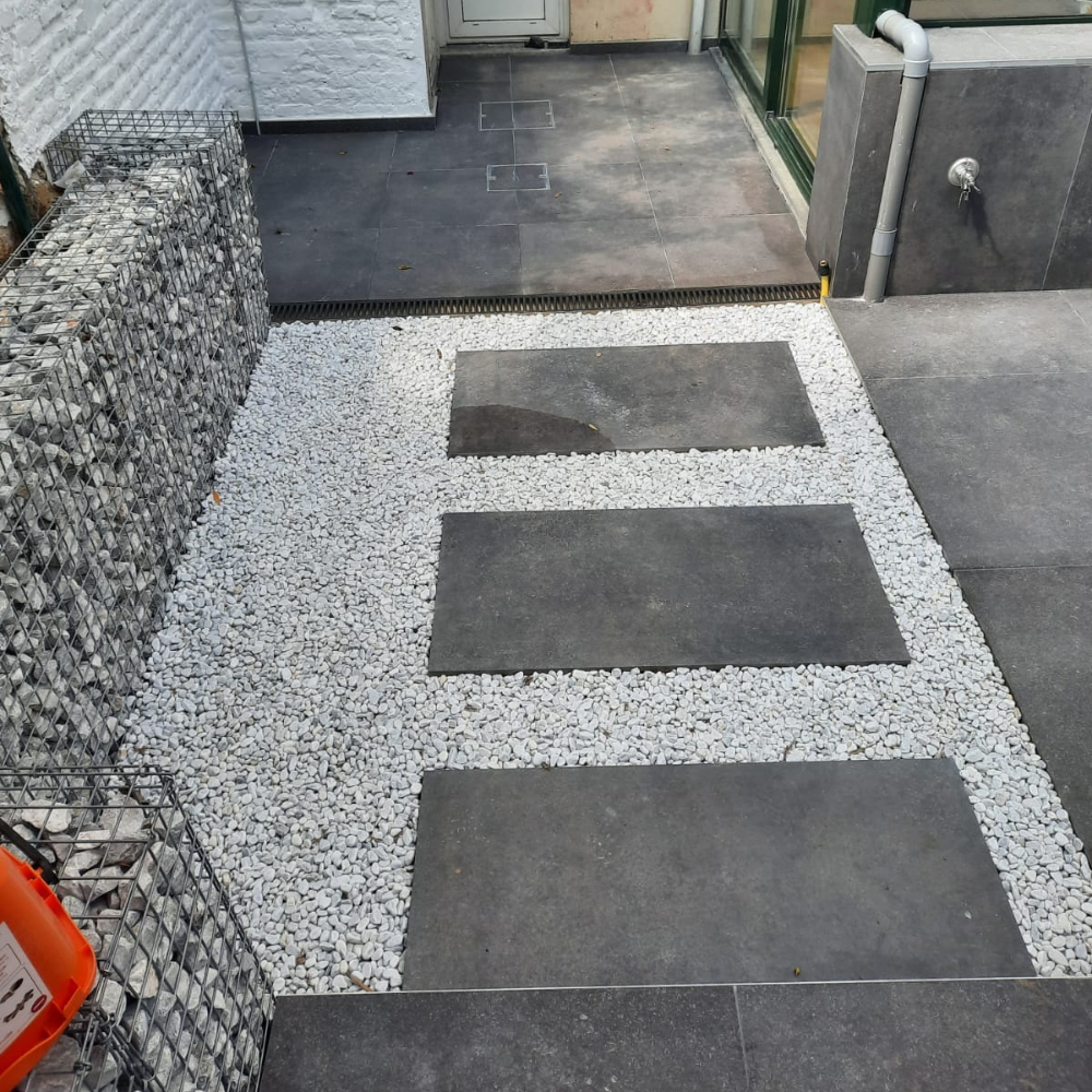 Création d'une terrasse extérieure et aménagement de cour. Le projet a nécessité du terrassement, l'évacuation de terre, et la pose de nouveaux pavés combinés à des murs de soutènement en gabions (cages métalliques remplies de pierres) pour structurer l'espace.