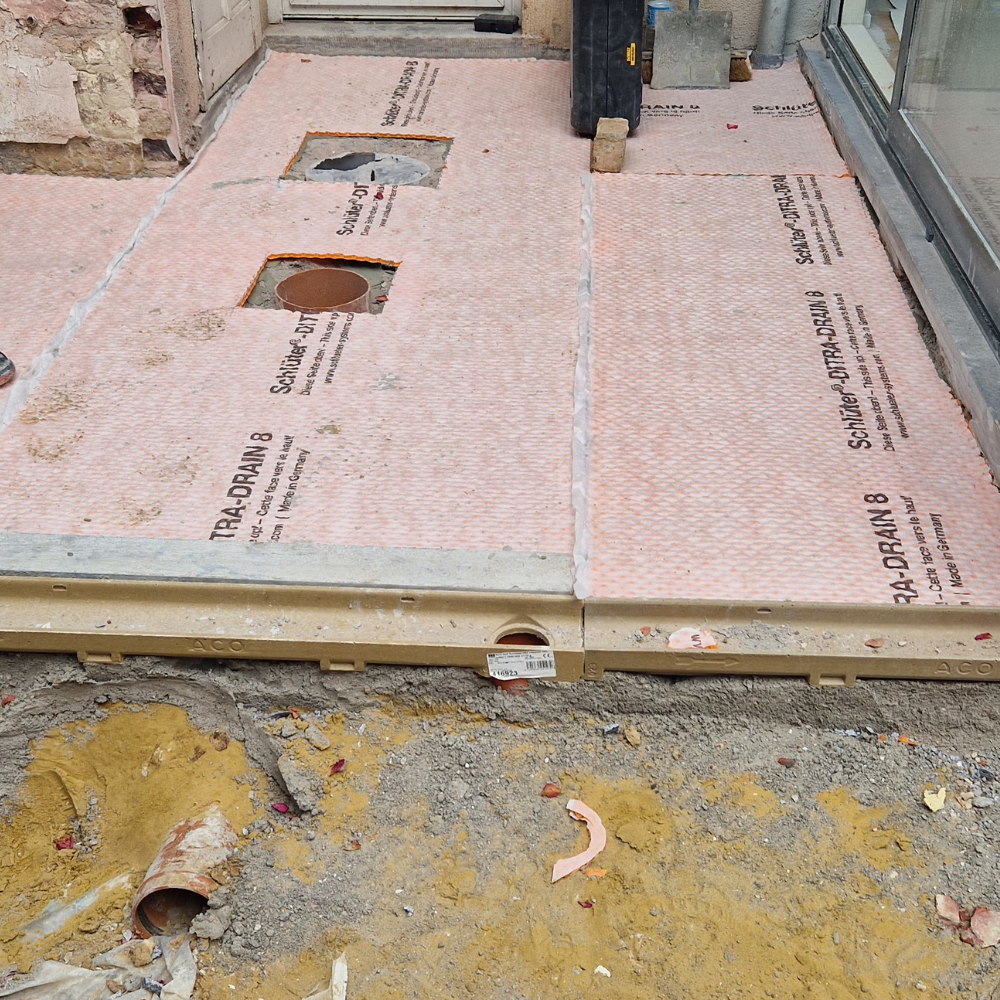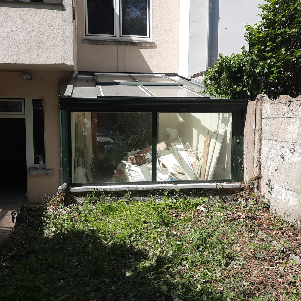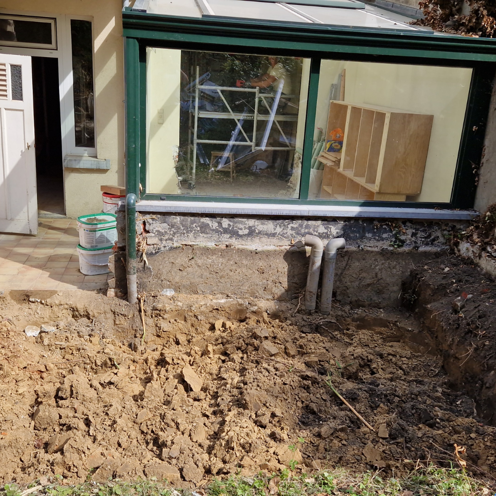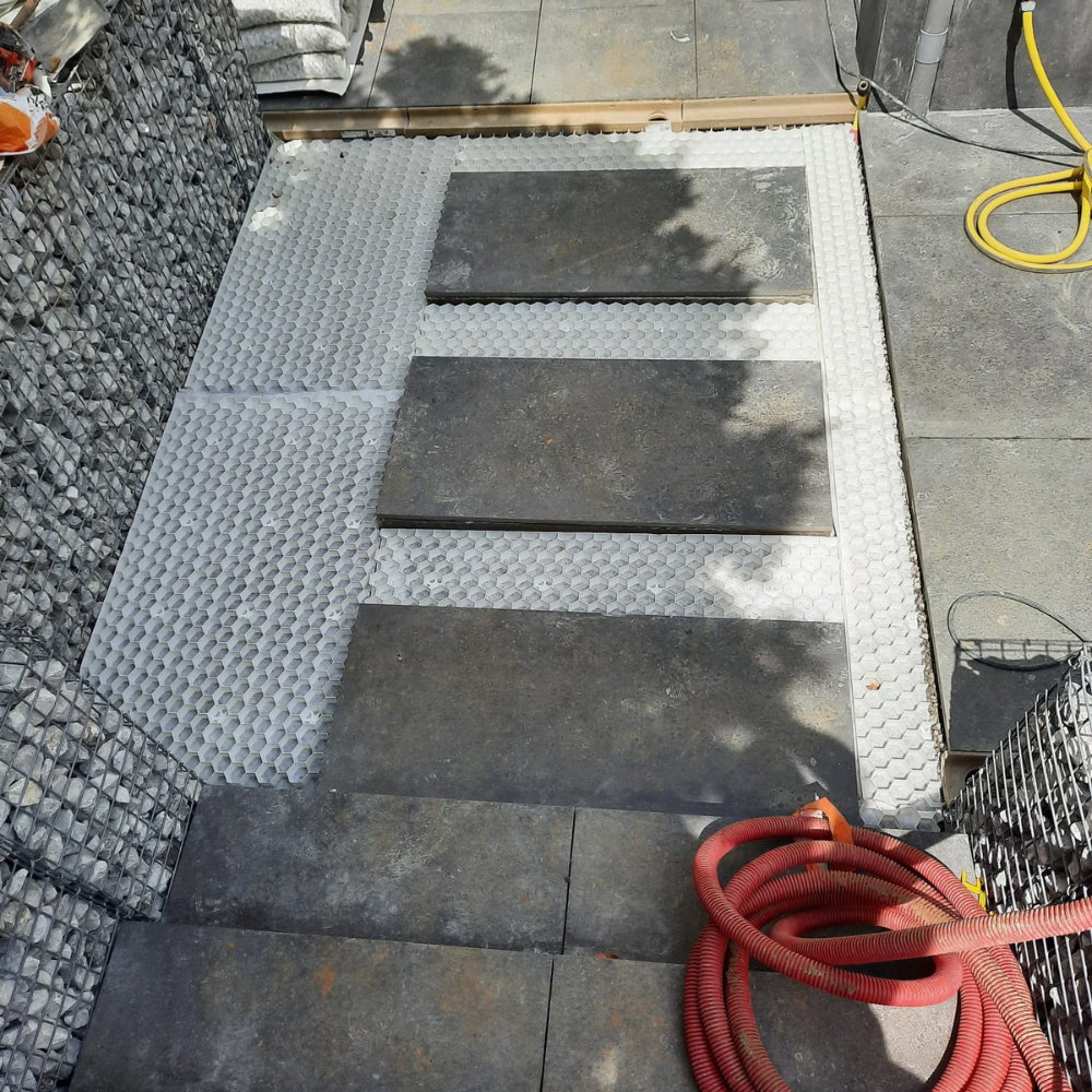 Création d'une terrasse extérieure et aménagement de cour. Le projet a nécessité du terrassement, l'évacuation de terre, et la pose de nouveaux pavés combinés à des murs de soutènement en gabions (cages métalliques remplies de pierres) pour structurer l'espace.