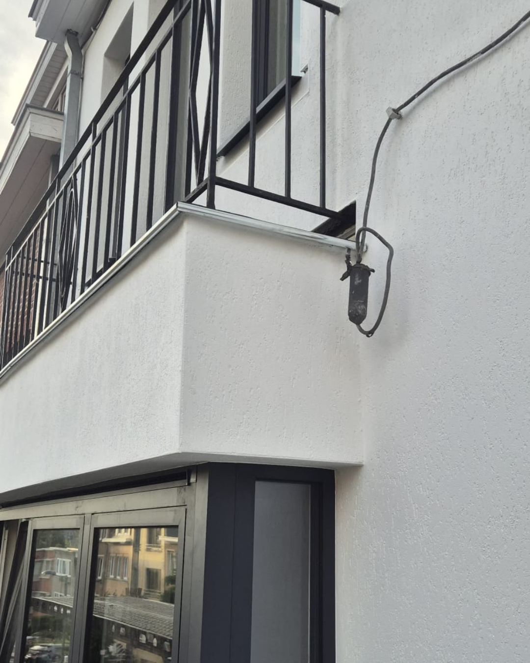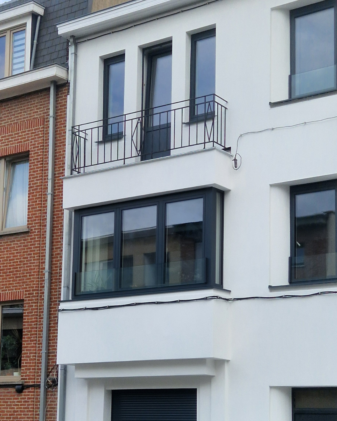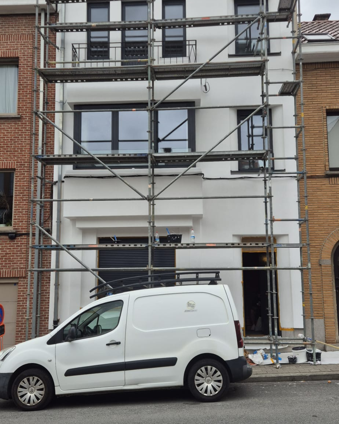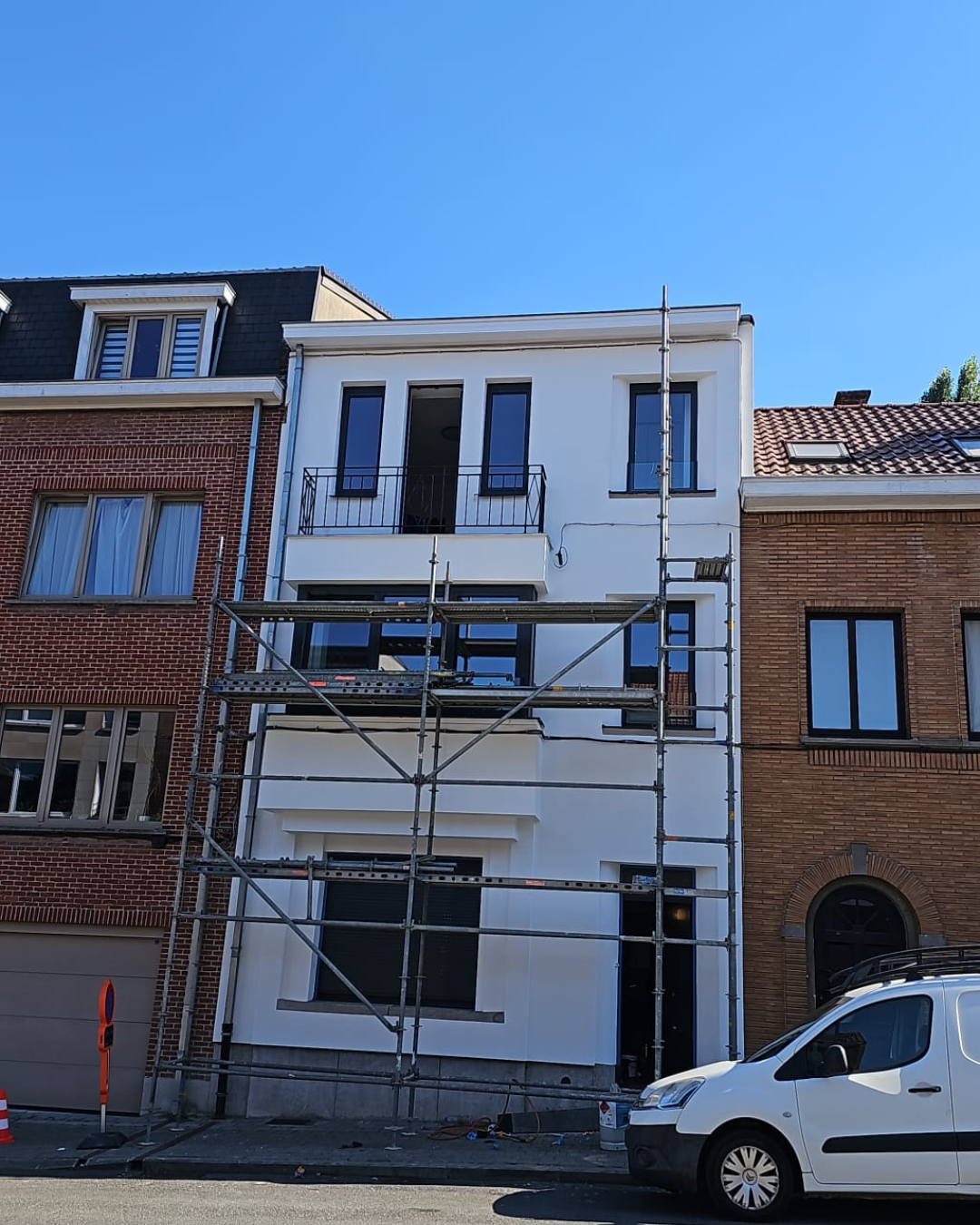 Restauration complète de la façade avant d'une maison de ville. Le projet a impliqué le nettoyage, la réparation des maçonneries et la mise en peinture (passage d'une brique brute à une finition blanche moderne), incluant probablement le remplacement ou la rénovation des châssis.