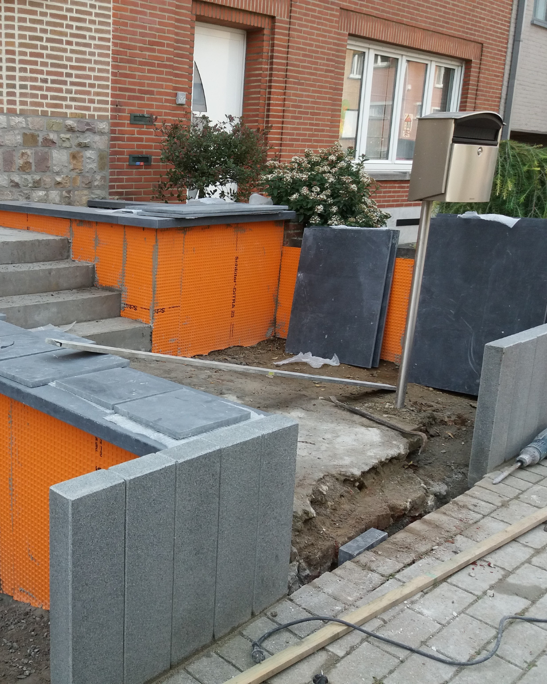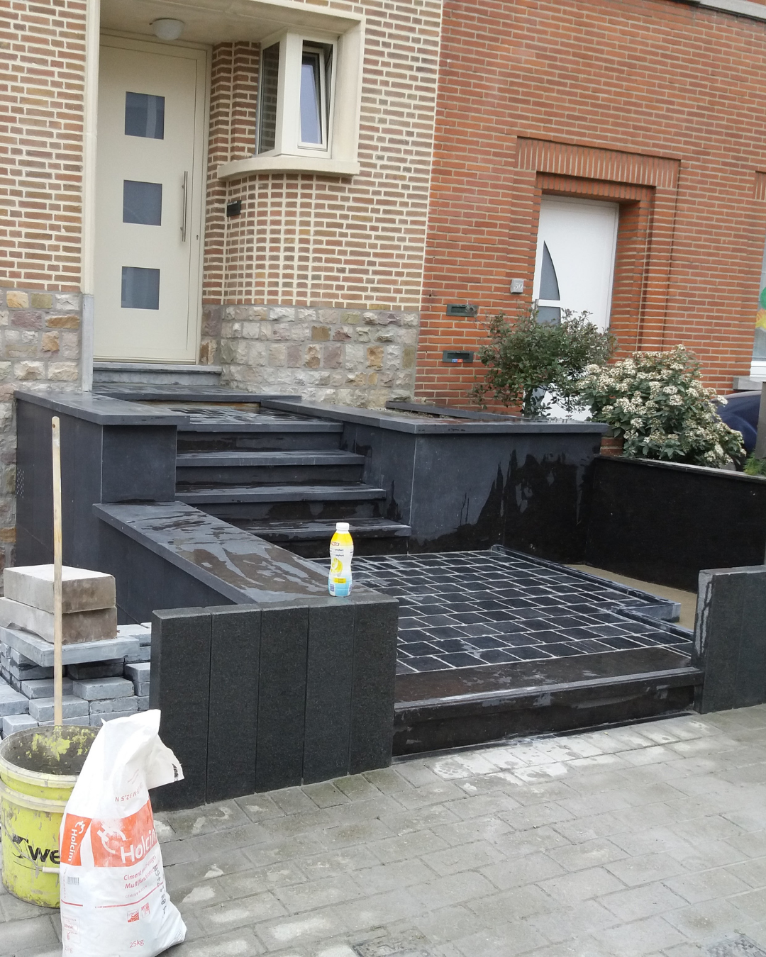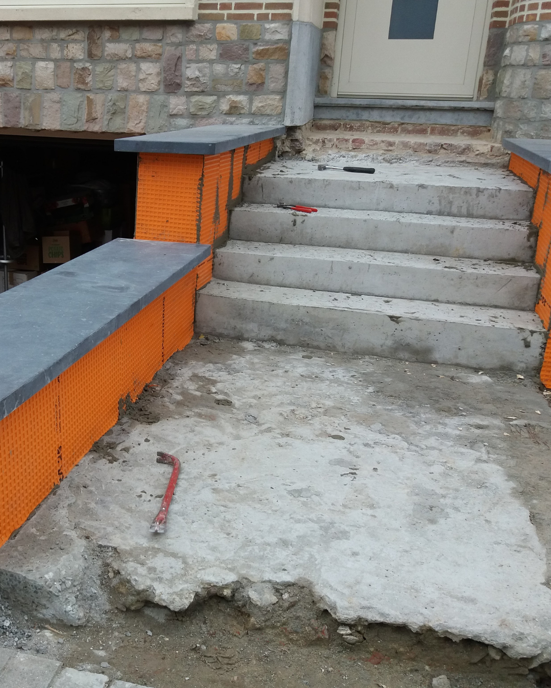 Rénovation des escaliers d'accès à la maison. Démolition de l'ancienne structure et création d'un nouvel escalier avec revêtement en carrelage foncé et finition des murets latéraux, offrant une entrée plus nette et moderne.