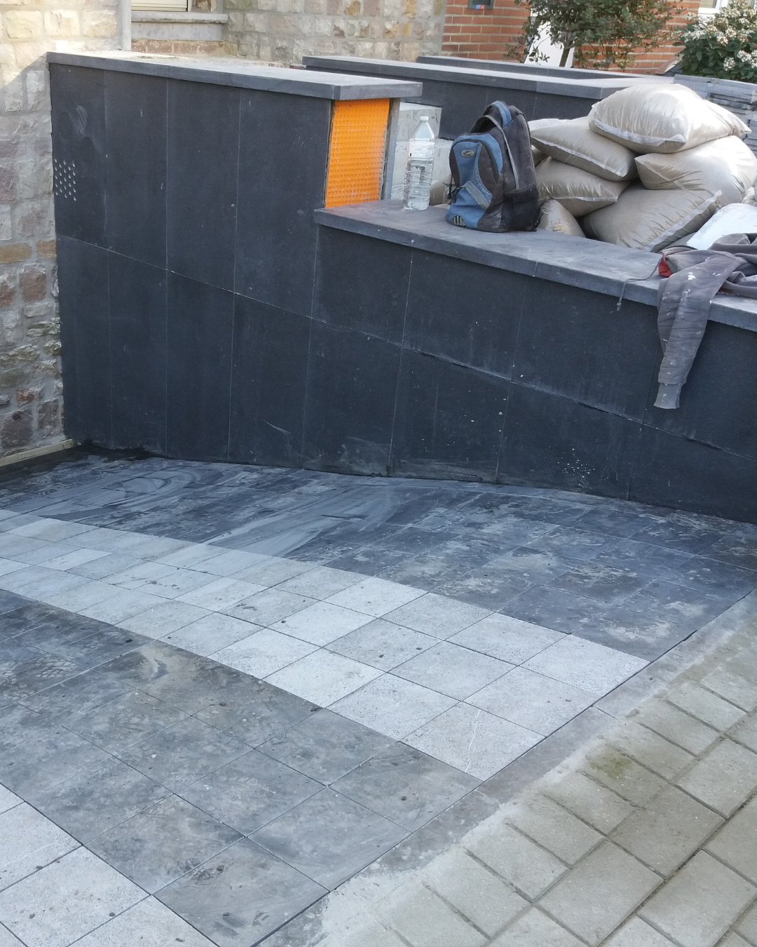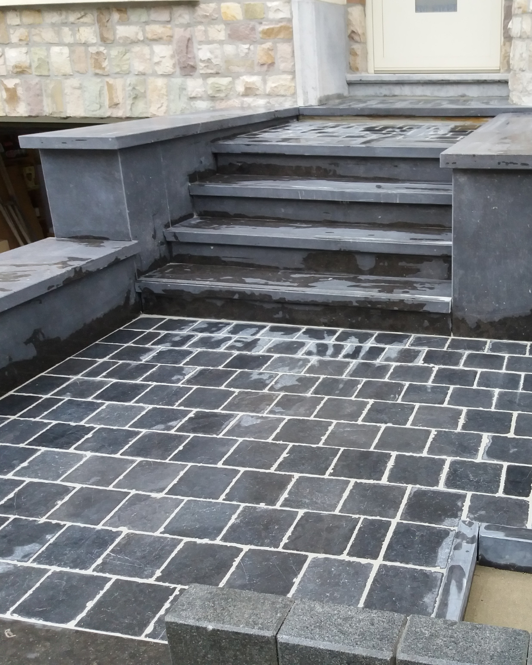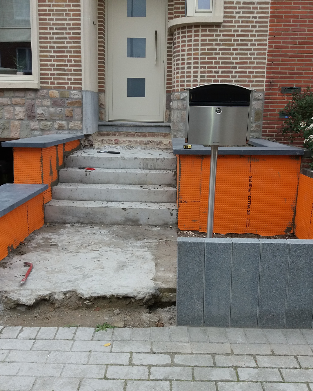 Rénovation des escaliers d'accès à la maison. Démolition de l'ancienne structure et création d'un nouvel escalier avec revêtement en carrelage foncé et finition des murets latéraux, offrant une entrée plus nette et moderne.